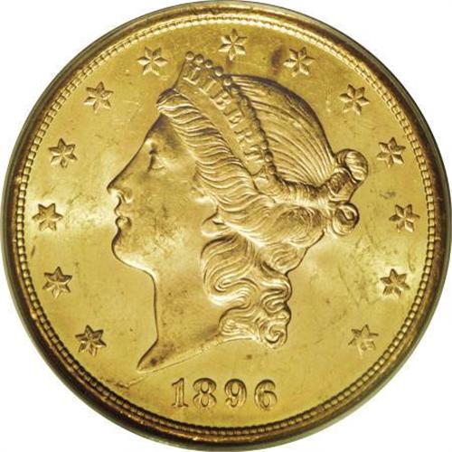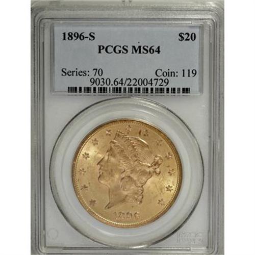 <B>1896-S $20 MS64 PCGS.</B></I> Lime and apricot shades endow this lustrous and carefully preserved Choice Liberty twenty. The 1896-S is readily acquired in MS61 through MS63, but due to indifferent storage, near-Gems are very scarce. PCGS and NGC have each certified only two examples in higher grades (3/08).<BR><BR><B>Coin Engraver:</B> James B. Longacre<BR><BR><b>Shipping:</b> Coins & Currency (<a target="_blank" href="http://www.heritageauctions.com/common/shipping.php">view shipping information</a>)