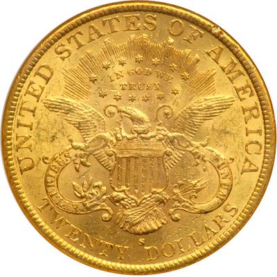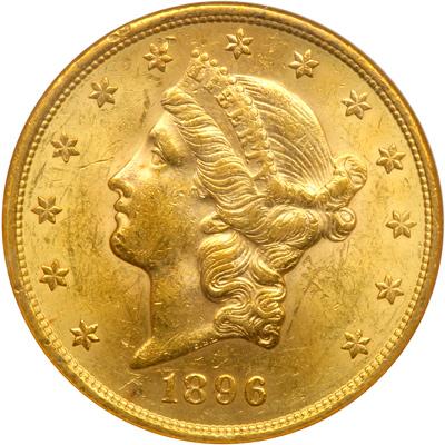 1896-S $20. NGC graded MS-61. Appealing golden orange colors are evident on both sides.