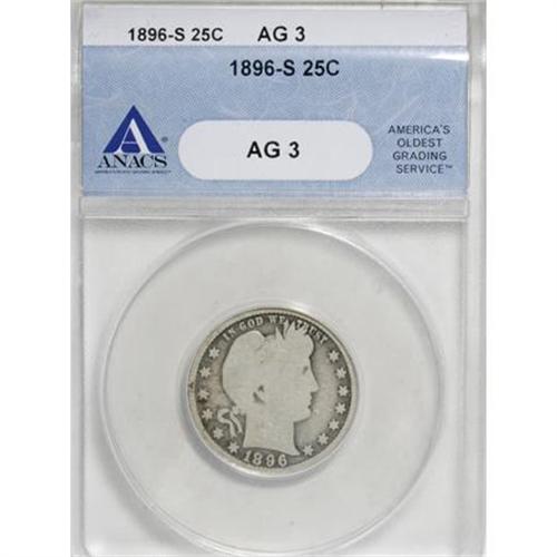 <B>1896-S 25C AG3 ANACS.</B></I> NGC Census: (32/148). PCGS Population (49/374). Mintage: 188,039. Numismedia Wsl. Price for NGC/PCGS coin in AG3 : $382. (#5615)<BR><BR><B>Coin Engraver:</B> Charles E. Barber<BR><BR><b>Shipping:</b> Coins & Currency (<a target="_blank" href="http://www.heritageauctions.com/common/shipping.php">view shipping information</a>)