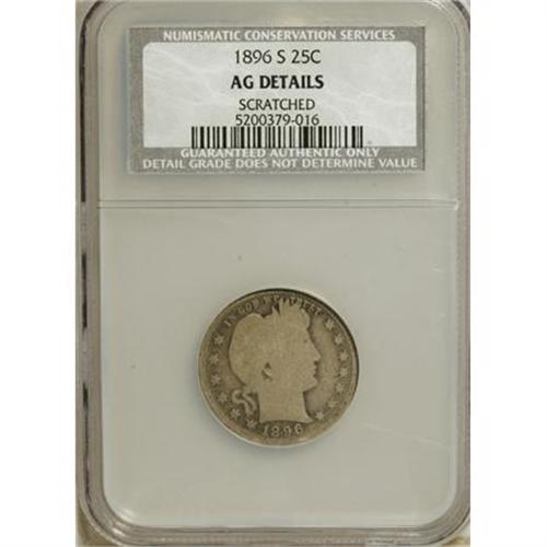 <B>1896-S 25C --Scratched--NCS. AG Details.</B></I> NGC Census: (7/180). PCGS Population (8/424). Mintage: 188,039. Numismedia Wsl. Price for NGC/PCGS coin in AG3 : $398. (#5615)<BR><BR><B>Coin Engraver:</B> Charles E. Barber<BR><BR><b>Shipping:</b> Coins & Currency (<a target="_blank" href="http://www.heritageauctions.com/common/shipping.php">view shipping information</a>)