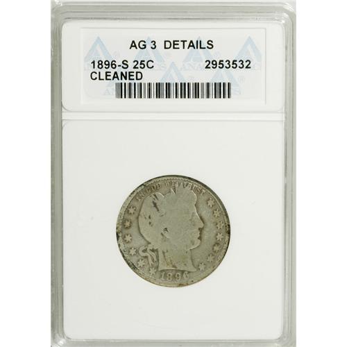 <B>1896-S 25C --Cleaned--ANACS. AG3 Details.</B></I> NGC Census: (0/172). PCGS Population (38/337). Mintage: 188,039. Numismedia Wsl. Price: $337. (#5615)<BR><BR><b>Shipping:</b> Coins & Currency (<a target="_blank" href="http://www.heritageauctions.com/common/shipping.php">view shipping information</a>)