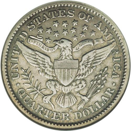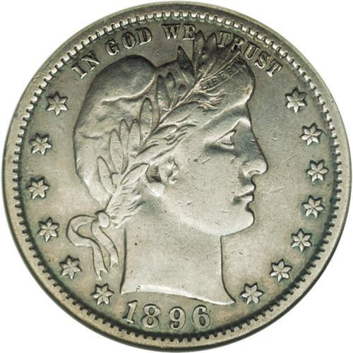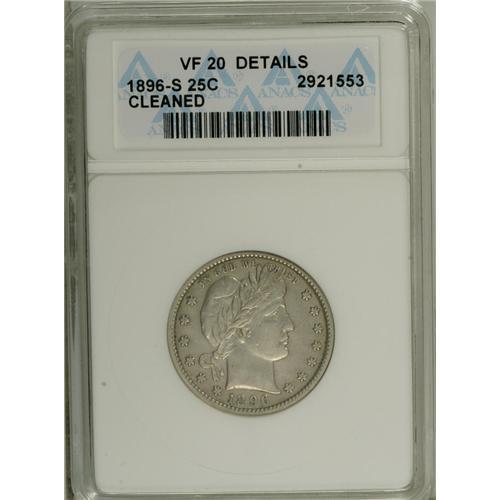 <B>1896-S 25C --Cleaned--ANACS. VF20 Details.</B></I> The 1896-S is one of the three key dates of the Barber quarter series, along with the 1901-S and 1913-S. This slate-gray piece deepens somewhat around the margins. The legends are bold and moderate wingtip wear is present. The glossy surfaces display the expected minor marks.<BR><BR><b>Shipping:</b> Coin/Currency (<a target="_blank" href="http://www.heritageauctions.com/common/shipping.php">view shipping information</a>)