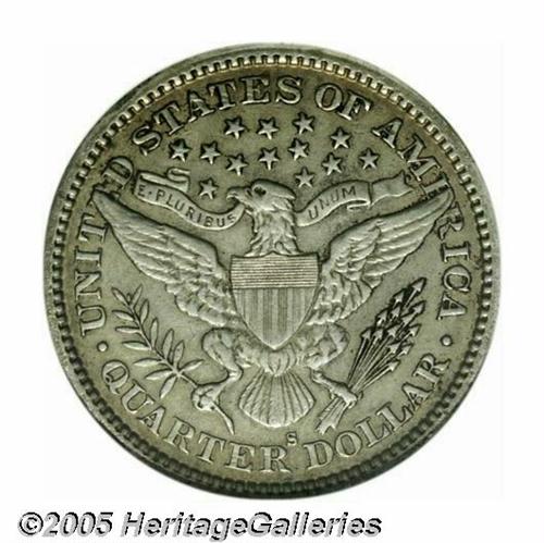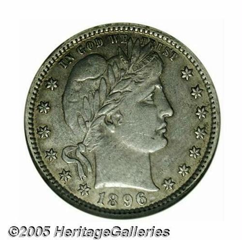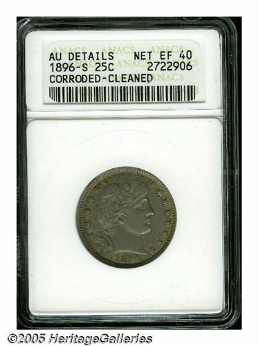 <B>1896-S<25C>--Corroded, Cleaned--ANACS. AU Details, Net XF40.</B></I> A dove-gray representative with peripheral golden-brown toning. A bit dull and grainy from a long ago cleaning, but much sharper than the vast majority of survivors, and not unattractive as a lightly circulated example. A member of the famous trio of key date Barber Quarters that include the 1896-S, 1901-S, and 1913-S.