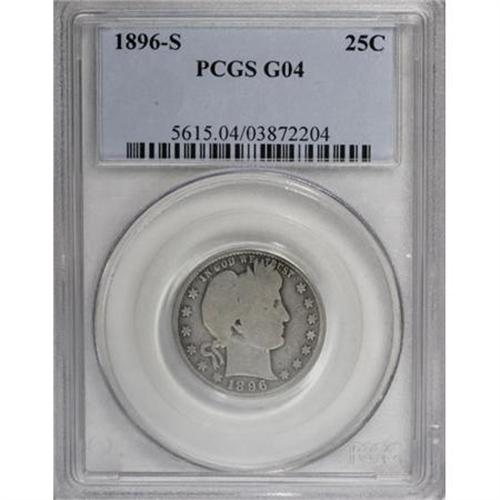 <B>1896-S 25C Good 4 PCGS.</B></I> Cream-gray devices contrast slightly with the subtle steel-blue and lilac fields. The right (facing) wing has a hair-thin mark, but the eye appeal is undeniable. One of the three S-mint key dates, along with the '01-S and '13-S.<BR><BR><B>Coin Engraver:</B> Charles E. Barber<BR><BR><b>Shipping:</b> Coins & Currency (<a target="_blank" href="http://www.heritageauctions.com/common/shipping.php">view shipping information</a>)