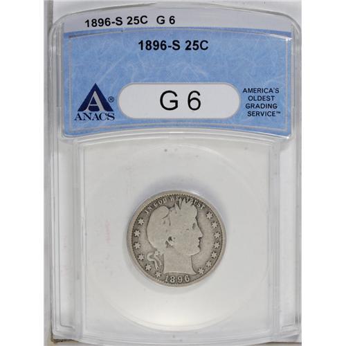 <B>1896-S 25C Good 6 ANACS.</B></I> Heavily worn, though the surfaces are exceptionally clean overall. The silver-gray devices give way to dove-gray and darker in the fields.<BR><BR><b>Shipping:</b> Coin/Currency (<a target="_blank" href="http://www.heritageauctions.com/common/shipping.php">view shipping information</a>)