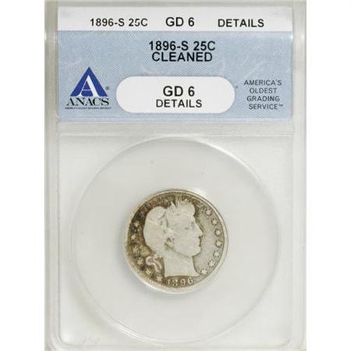 <B>1896-S 25C --Cleaned--ANACS. Good 6 Details.</B></I> The 1896-S is the first of the big three Barber quarter issues, along with the 1901-S and 1913-S. The present piece is slate-gray save for blushes of orange-red and aquamarine across the left obverse field. The portrait displays wispy hairlines.<BR><BR><B>Coin Engraver:</B> Charles E. Barber<BR><BR><b>Shipping:</b> Coins & Currency (<a target="_blank" href="http://www.heritageauctions.com/common/shipping.php">view shipping information</a>)