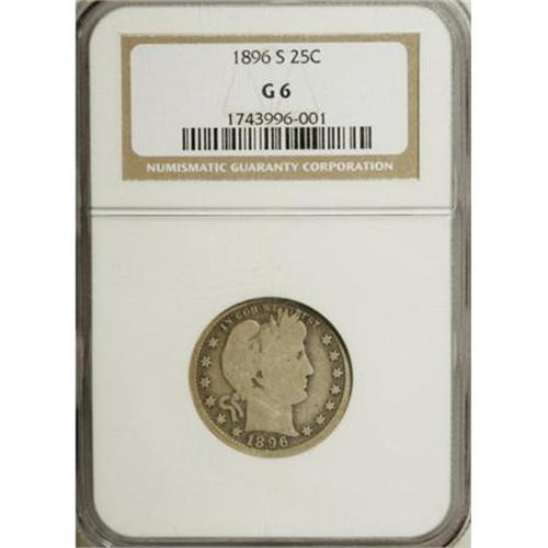 <B>1896-S 25C Good 6 NGC.</B></I> Light gray surfaces take on slightly deeper hues in the areas around the design elements. The obverse rim is full, while the reverse rim is a tad weak in the lower left quadrant. A pleasing Good 6 key date representative. A few old linear marks on each side are noted.<BR><BR><B>Coin Engraver:</B> Charles E. Barber<BR><BR><b>Shipping:</b> Coins & Currency (<a target="_blank" href="http://www.heritageauctions.com/common/shipping.php">view shipping information</a>)