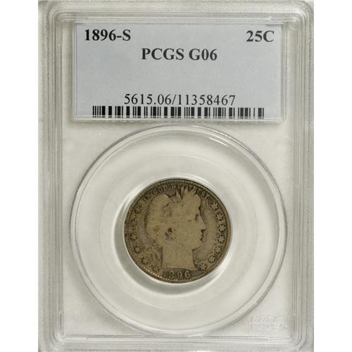 <B>1896-S 25C Good 6 PCGS.</B></I> Gold-gray and teal-brown patina is the rule for this key-date Barber quarter. On Liberty's headband, the L and Y are weak but complete, while the I and T are partly visible.<BR><I>From The Reginald Byron Mason Collection.</B></I><BR><BR><b>Shipping:</b> Coins & Currency (<a target="_blank" href="http://www.heritageauctions.com/common/shipping.php">view shipping information</a>)