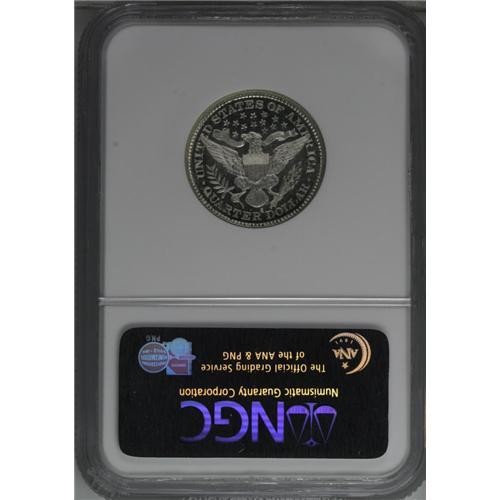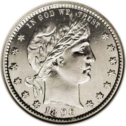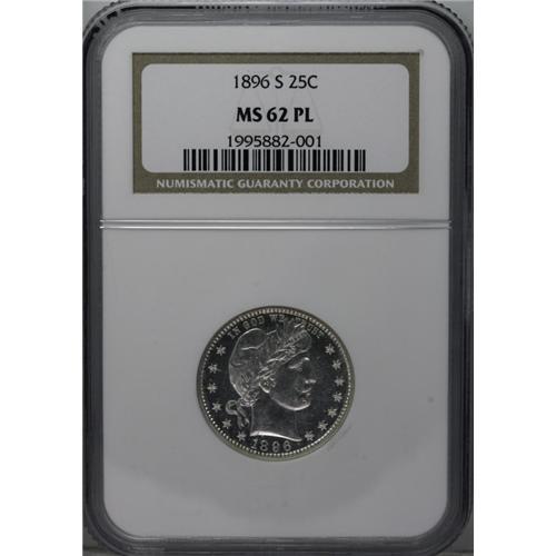 <B>1896-S<25C> MS62 Prooflike NGC.</B></I> This is the first of the well-known troika of Barber quarter key dates, here in superlative condition. The radiant surfaces are bluish-silver, with no hint of toning. Mint frost coats the devices, moderately on the obverse and deeply on the reverse. A few dark toning flecks are not easily visible without a loupe. Were it not for two pairs of reeding marks on the cheek--clear evidence of coin-to-coin contact--this piece would probably grade at least one, or possibly two points higher. As it is, <I>this is the only 1896-S quarter to achieve the Prooflike designation at either service </B></I>(8/06).