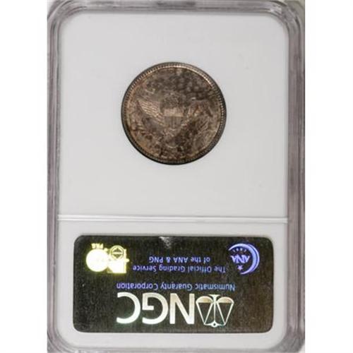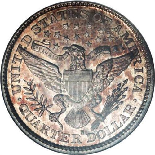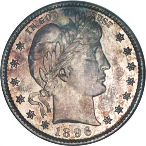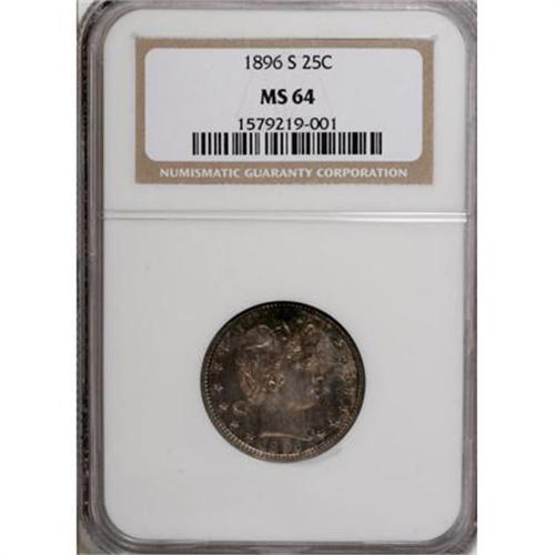 <B>1896-S 25C MS64 NGC.</B></I> As the highest-mintage issue among the "Big Three" Barber quarters, the 1896-S has the lowest price through most grades. While the 1913-S was saved in small quantities at the time of production, the 1896-S was not, and in Select Mint State, the earlier issue commands a stronger premium. Anything finer is a condition rarity.<BR> The Choice example in this lot offers remarkable eye appeal for the grade assigned. Rose and champagne shadings dominate each side, though the area around WE in IN GOD WE TRUST shows a blue-green tint. The luster is vibrant, almost flashy on the reverse, and the minor abrasion on the chin that partly accounts for the grade is hardly distracting. Decisively struck and delightful. Census: 13 in 64, 8 finer (11/07).<BR><BR><B>Coin Engraver:</B> Charles E. Barber<BR><BR><b>Shipping:</b> Coins & Currency (<a target="_blank" href="http://www.heritageauctions.com/common/shipping.php">view shipping information</a>)