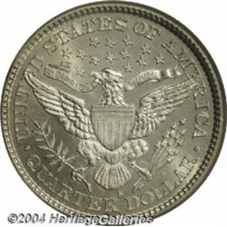 <B>1896-S<25C> MS64 PCGS.</B></I> Along with the 1901-S and the 1913-S, the 1896-S is one of the "big three" keys to the Barber Quarter series. Survivors are coveted even in basal circulated condition, and a pleasing near-Gem is worthy of the finest specialized holding. This is an impressive example, since the surfaces are fully brilliant and the strike is razor-sharp, even on the fletchings and shield corners. The cartwheel luster is satiny and complete, and the fields are surprisingly close to pristine. The portrait is beautifully preserved, since a tiny tick on the jaw merits mention only as a pedigree marker. Expect a strong bid to be requisite for the next owner of this notable example. Population: 14 in 64, 10 finer (7/04). <BR><BR><B>Important notice:</B> Heritage usually auctions material at the rate of 200-250 lots per hour. On some occasions eBay Live bid software or the Internet may not be able to keep up with the pace of the auction. We recommend placing a realistic absentee bid now as insurance to avoid disappointment. Occasionally the auctioneer may eliminate or reject an eBay Live bid, and the auctioneer may also reopen a lot after the close of the eBay live bidding (usually because we missed an audience bid), and may reject your bid even if it shows you as the winning bidder. By bidding via eBay Live, you agree that Heritage may award the lot to another bidder at its sole discretion under the circumstances described above or any other reasonable circumstances. Since eBay bids are not shown to us until we open the lot on the floor, we treat those bids just like floor bids. In most cases the floor responds before the eBay bid is presented to us, due to Internet lag time, so for consistency we have made it a policy that floor bids are always considered first over tie eBay live bids. Also please note that all Heritage lots purchased through eBay Live carry a 20% Buyer's Premium. Please make sure you read the Terms and Conditions before you bid. </span></font></tr></table></td></tr></table>