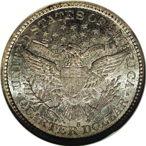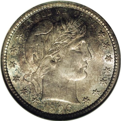 <B>1896-S<25C> MS65 NGC.</B></I> Ex: Richmond Collection. Obverse Die 2, Reverse Die 2. It is a backhand compliment to the rarity of the 1896-S quarter that coins have been altered to simulate this S-mint. Legitimate S-mint quarters from 1892 through 1897 have a distinctive rectangular shape, while those made after 1897 have a rounder appearance. Only two date and mintmark positions are known, and as a general rule most of the genuine 1896-S quarters have horizontal clash marks inside Liberty's ear.<BR> The 1896-S is very scarce in XF and better grades, and Mint State pieces are always in demand by advanced collectors of this series. Unlike many '96-S quarters, this piece shows only slight reflectivity in the fields. The surfaces have bright, sparkling mint luster that is readily apparent even through the rich golden-rose and blue speckled toning that covers both obverse and reverse. A few tiny marks can be made out through the toning with a magnifier, but these are of no consequence to the technical grade or appearance of this important quarter. Sharply defined on each side, there are no mentionable areas of weakness. An outstanding example of this key date quarter with an impressive pedigree to match.