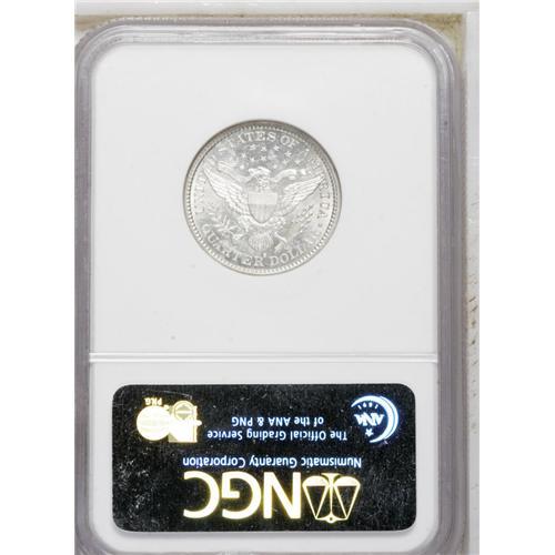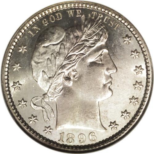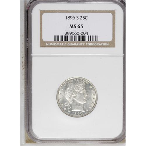 <B>1896-S<25C> MS65 NGC.</B></I> Obverse Die 2, Reverse Die 2 (per David Lawrence's second edition of <I>The Complete Guide to Barber Quarters).</B></I> The 1 in the date is centered over the right edge of a denticle, and the 8 is nearly centered over a denticle. The mintmark is lower than on Reverse Die 1, and closer to the R than the D in QUARTER DOLLAR.<BR> As one of the great triumvirate of key dates in the Barber quarter series, along with the 1901-S and 1913-S, the 1896-S is the first issue that is truly rare in Fine/Very Fine and higher grades. Lawrence assigns an R.5 rating to Fine/Very Fine coins, an R.6 to XF and Mint State (presumably lower-Mint State) pieces, and an R.7 to AU examples of this issue. As of (8/06), NGC has graded a total of 29 examples in all Mint State grades, while PCGS has graded 28 Mint State examples. (Both figures undoubtedly include multiple resubmissions.) This beautiful coin is nearly among the finest graded, exceeded only by a single example at each service (an MS66 at PCGS, and an MS67 at NGC).<BR> The surfaces on this Gem example are basically brilliant, although the careful viewer might detect a slight ice-blue cast on each side. The luster is intense and unbroken, although there is little field/device contrast noted. Under a loupe only, a few light, undistracting abrasions can be seen on Liberty's cheek and neck, which are mentioned only because they collectively appear to limit an even higher grade. Few other mentionable contact marks are seen, save for a couple of tiny ticks on the shield stripes. The strike is well executed, notably on the often-weak right (facing) shield border and the eagle's right claw, with the only mentionable quibble being some slight softness on the upper right wing. This is a rare opportunity to obtain one of the finest examples of this issue, a coin that will contribute greatly to a superb set of Barber coina