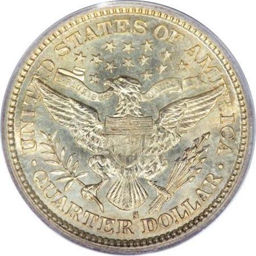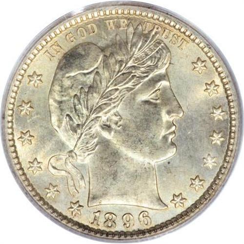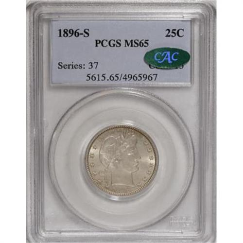 <B>1896-S 25C MS65 PCGS. CAC.</B></I> "People check the 1916-D Mercury dime or the 1909-S VDB Lincoln cent, but they tend to brush right by the price listing of Barber quarters." Paul M. Green highlighted the lack of interest in Barber quarters in his July 16, 2002 edition of "Item of the Week" for <I>Coin World</B></I>. In the years since Green wrote those words, Barber quarters have enjoyed increasing popularity, particularly among collectors seeking undervalued and underappreciated series as the coin market heated up.<BR> While the 1896-S is perceived by most to be the least challenging of the "Big Three" Barber quarter issues to acquire, that perception holds true only for circulated pieces. The 1896-S, despite a mintage over four times that of the 1913-S, is far more elusive than the later issue in Mint State grades. The 1913-S was known to be a low-mintage issue from the start, and as a result, collectors from the burgeoning numismatic population of the early 20th century saved numerous examples. By contrast, the 1896-S slipped unnoticed into circulation, and it was not until much later that the issue was recognized as a condition rarity. With only nine Gems graded by PCGS and just one coin finer (1/08), however, the challenge of finding an MS65 example is clear.<BR> The opportunity to acquire an 1896-S quarter with the twin attributes of high grade and excellent eye appeal comes only infrequently. Both sides offer potent luster with delicate silver-gray and golden tints over the fields. Subtle frost sparkles softly on the solidly struck and pleasingly preserved devices. In short, a wonderful example of this key-date issue.<BR><I>From The Southwest Collection.</B></I><BR><BR><B>Coin Engraver:</B> Charles E. Barber<BR><BR><b>Shipping:</b> Coins & Currency (<a target="_blank" href="http://www.heritageauctions.com/common/shipping.php">view shipping information</a>)