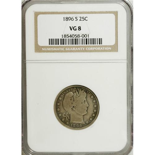 <B>1896-S 25C VG8 NGC.</B></I> This evenly worn example is free of distracting abrasions and has a pleasingly original appearance. An important key date from a scarce mintage of just 188,039 pieces.<BR><BR><b>Shipping:</b> Coins & Currency (<a target="_blank" href="http://www.heritageauctions.com/common/shipping.php">view shipping information</a>)
