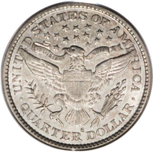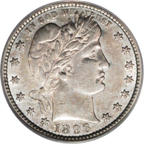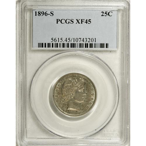<B>1896-S 25C XF45 PCGS.</B></I> The 1896-S qualifies as one of the "key" dates of the Barber quarter series. This Choice XF specimen exhibits traces of luster in the recesses, and retains excellent definition on the design elements. Bright silvery-gray surfaces reveal wisps of ice-blue, and are remarkably clean. A few minute marks around Liberty's eye may aid in pedigreeing the coin.<BR><BR><b>Shipping:</b> Coins & Currency (<a target="_blank" href="http://www.heritageauctions.com/common/shipping.php">view shipping information</a>)