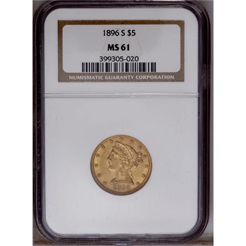 <B>1896-S<$5> MS61 NGC.</B></I> Apricot-gold surfaces display somewhat subdued luster and nicely brought up design elements. Light contact marks are seen on Liberty's cheek and neck, and in the field beneath the eagle's right (left facing) wing. Census: 28 in 61, 13 finer (1/06).
