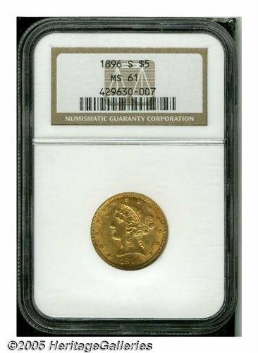 1896-S $5 MS61 NGC. Lustrous and mildly abraded,