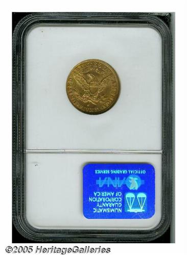 <B>1896-S<$5> MS61 NGC.</B></I> Lustrous and mildly abraded, with good striking details, except on the obverse stars, and variegated mint-green and red-orange toning that gives the piece an extra degree of flair. A very scarce S-mint issue that is rarely seen in AU or better condition. Population: 27 in 61, 13 finer (5/05).