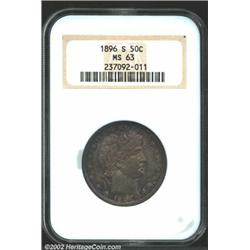 1896-S 50C MS63 NGC. The 1896-S is one of the few Barber Half Dollars that can rightly be considered a key date. The mintage figures for most issues in this series are comparable, and, unlike the 1896-S, 1901-S, and 1913-S Barber Quarters, none of the similarly designed Half Dollar dates are widely recognized for their overall rarity. There are, nonetheless, many conditionally rare issues, although the 1896-S is relatively scarce in all grades. Satin luster shimmers beneath rich, mottled, lavender-russet toning on both sides of the present NGC-certified survivor. The strike is uncommonly bold for the type, and there are no outwardly distracting abrasions. Just 1.1 million Half Dollars were produced at the San Francisco Mint in 1896.From the Ohio Collection. Important notice: We expect to be auctioning lots at the rate of 200-250 per hour. Sometimes eBay Premier live bid software cannot keep up with that pace, so we strongly recommend that you place a realistic proxy bid now as insurance to avoid disappointment. Also please note that all Heritage/CAA lots purchased through eBay Premier carry a 20% Buyer's Premium. Please make sure you read the Terms and Conditions.