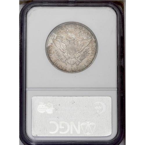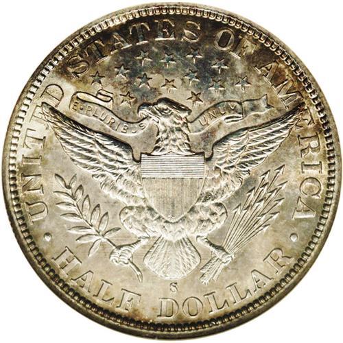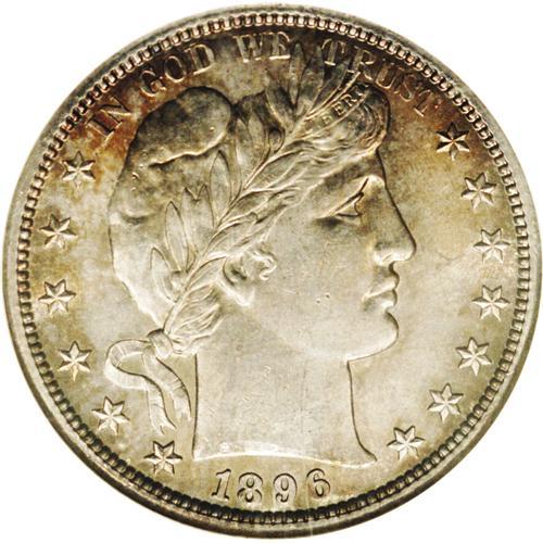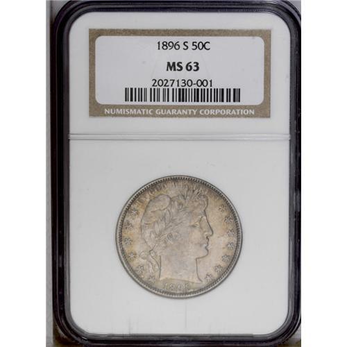 <B>1896-S<50C> MS63 NGC.</B></I> This is a scarce issue in all grades with just 1.1 million pieces produced. The present example displays dominant steel-gray patination over which dappled orange-russet shadings have gathered. The satin-textured surfaces are suitably lustrous for the grade, and the razor sharp strike is praiseworthy for a representative of this often poorly produced type.