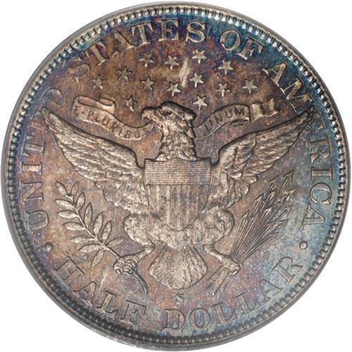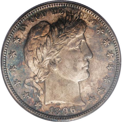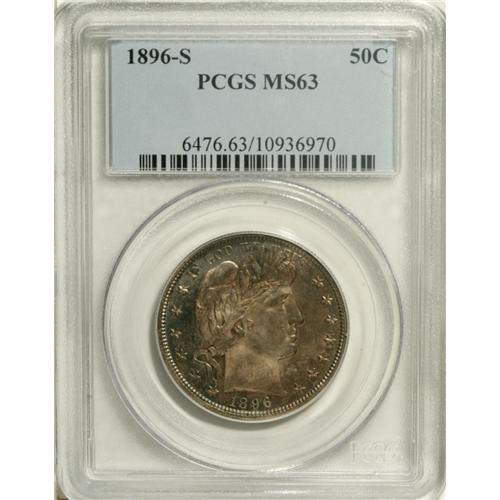 <B>1896-S 50C MS63 PCGS.</B></I> Splashes of forest-green, golden-brown, and electric-blue embrace this mildly prooflike and decisively struck Barber half. The cheek has a few faint vertical roller marks of mint origin, but both sides are surprisingly devoid of marks. The 1896-S is a better date in Mint State, and is rarely seen with such splendid multicolor toning. Population: 12 in 63, 31 finer (12/06).<BR><BR><b>Shipping:</b> Coins & Currency (<a target="_blank" href="http://www.heritageauctions.com/common/shipping.php">view shipping information</a>)