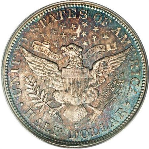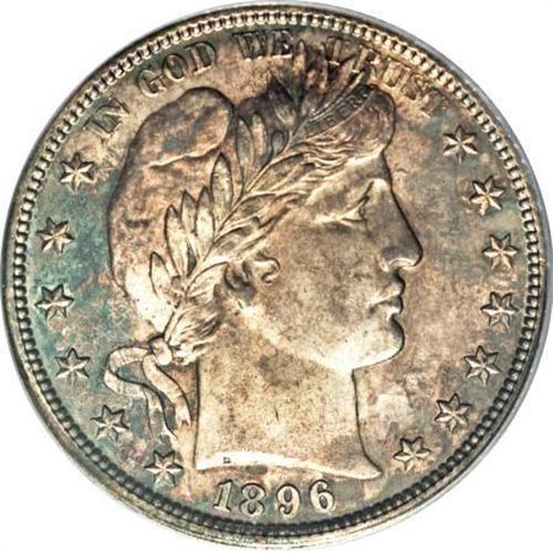 <B>1896-S 50C MS64 PCGS.</B></I> Another semikey Barber half issue, despite its mintage of more than 1.1 million pieces. Mottled smoke-gray, silver-pink, and aqua toning graces each side, while failing to dampen the radiant luster. A bold strike completes the appeal. Population: 19 in 64, 14 finer (3/08).<BR><BR><B>Coin Engraver:</B> Charles E. Barber<BR><BR><b>Shipping:</b> Coins & Currency (<a target="_blank" href="http://www.heritageauctions.com/common/shipping.php">view shipping information</a>)