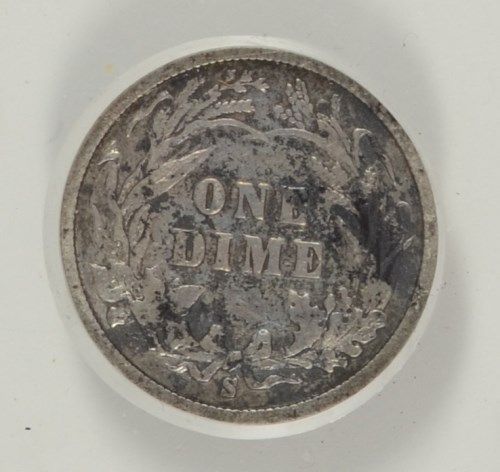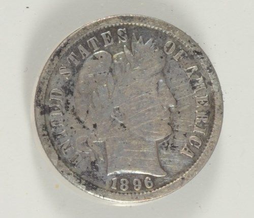 1896-S BARBER DIME FINE, DARK, MINOR MARKS