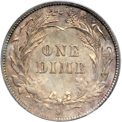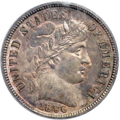 1896-S Barber Dime. PCGS graded MS-64. A well struck example exhibiting natural shades of violet toning. This crisply original coin is toned over frosted fields and devices. Pertaining to the devices, all aspects of the design were made with methodical precision. Only 575,056 minted. Pop 25; 22 finer with 17 in 65, 5 in 66 (PCGS # 4811) .
