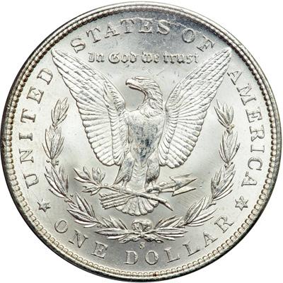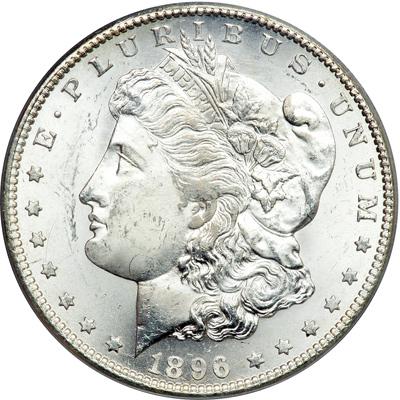 1896-S Morgan Dollar. PCGS graded MS-64. A blast white coin with lovely mint bloom. Some dates in the 1890s are relatively common, others relatively rare (1892-S, 1893-S, 1895-S). The 1896-S lies somewhere in the middle in choice Mint State condition, with none too many offered for sale at any one time. Pop 422; 52 finer, 49 in 65, 1 in 66, 1 in 67, 1 in 69 (PCGS # 7244) .