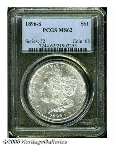 <B>1896-S<S$1> MS62 PCGS.</B></I> Mint State 1896-S dollars are quite elusive in the context of San Francisco Mint Morgan issues. The MS62 presented here has flashy lustrous surfaces that are virtually untoned. The design features are adequately struck, showing just a trace of softness in the hair above Liberty's ear. A few light to moderate contact marks and luster grazes on Liberty's cheek and in the left (facing) obverse field limit the grade.