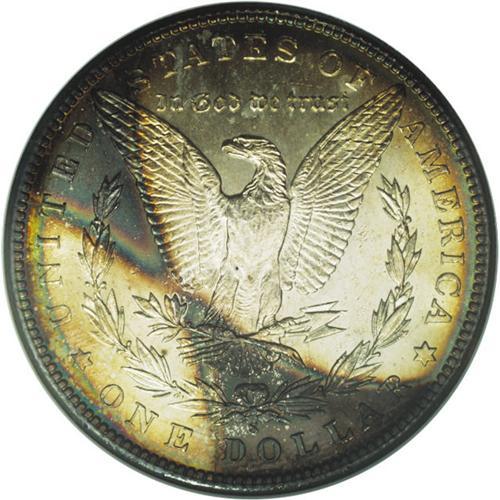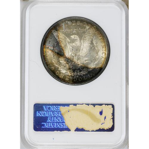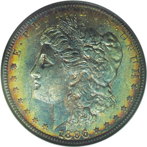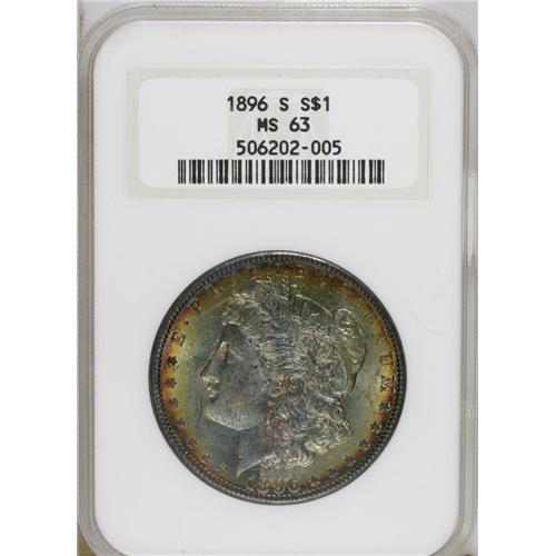 <B>1896-S S$1 MS63 NGC.</B></I> The toning aficionado will find this coin to be a source of delight. The obverse patina is as colorful as any that can be found, and includes a central coating of sea-green, along with a rainbow of gold, crimson, and cobalt-blue iridescence near the periphery. The reverse displays a pair of dense, triangular purple-brown areas. The piece is well struck, with typical small marks and abrasions for the grade.<BR><BR><b>Shipping:</b> Coins & Currency (<a target="_blank" href="http://www.heritageauctions.com/common/shipping.php">view shipping information</a>)