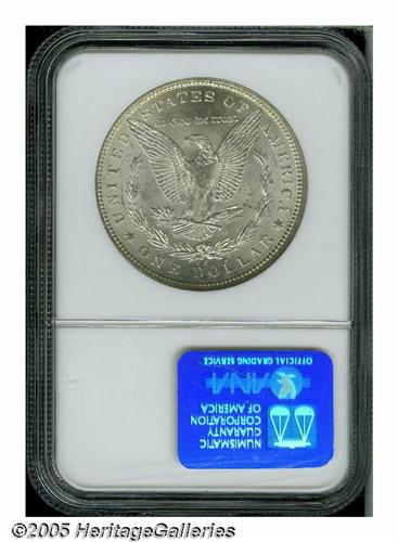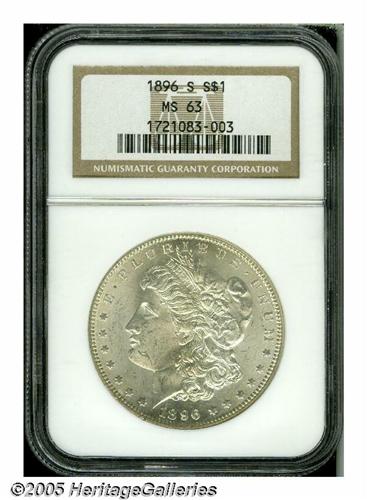 <B>1896-S<S$1> MS63 NGC.</B></I> Untoned with bright, satiny luster and better than average sharpness in the centers. Looking at the mintage of the '96-S and comparing it with other S-mint Morgans, one would never suspect that it is one of the more difficult and sought-after issues for the price and missing from many a Silver Dollar collection. The Redfield hoard contained a small quantity of Uncirculated pieces of average quality, but not nearly enough to satisfy demand by collectors.