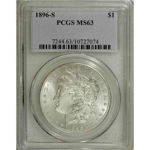 <B>1896-S S$1 MS63 PCGS.</B></I> An elusive issue in the higher Mint State grades, notably MS64 and higher. This example is brilliant, with lovely, coruscating luster, but the strike is typically soft, showing roller marks above Liberty's ear and a lack of definition on the eagle's breast. A few bag marks, none too severe, show on each side.<BR><I>From The Twin Hollows Collection, Part Two.</B></I><BR><BR><b>Shipping:</b> Coins & Currency (<a target="_blank" href="http://www.heritageauctions.com/common/shipping.php">view shipping information</a>)