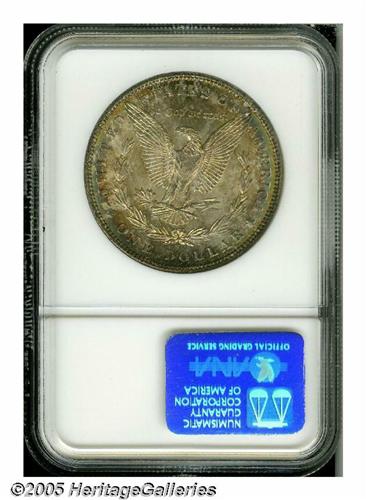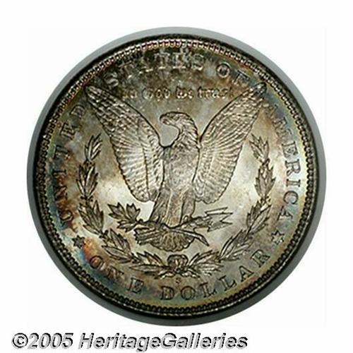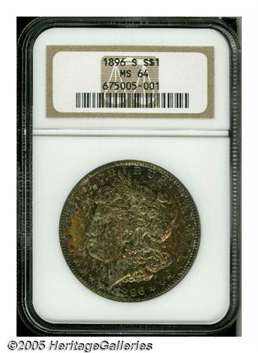 <B>1896-S<S$1> MS64 NGC.</B></I> Colorful multicolored iridescent hues dance over both the obverse and reverse. The latter side is noticeably brighter. Satiny, coruscant luster lies just under the attractive toning. Close examination is needed to see a few grade-limiting marks concentrated on the obverse. Typically struck for the issue.