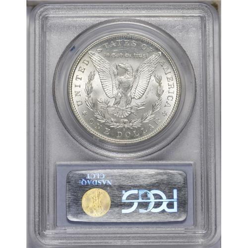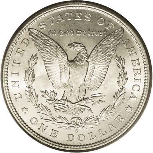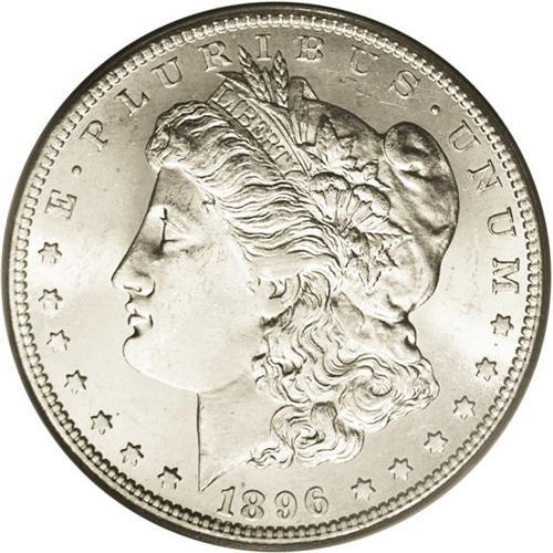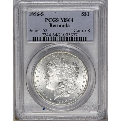 <B>1896-S<img border='0' src='http://www.heritagecoins.com/images/star.gif' width=10 height=10>$1> MS64 PCGS.</B></I> Ex: Bermuda Collection. Untoned with bright, satiny luster and some pronounced softness at the highest points. A few mint-made roller marks are also visible at the centers. Looking at the mintage of the '96-S and comparing it with other S-mint Morgans, one would never suspect that it is one of the more difficult and sought-after issues in the series and missing from many a silver dollar collection. The Redfield hoard contained a small quantity of Uncirculated pieces of average quality, but not nearly enough to satisfy demand by collectors. Choice specimens, such as this, occasionally surface but are quickly snatched up by the astute buyer.<BR><I>From The Chicago-Ark Collection.</B></I>