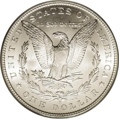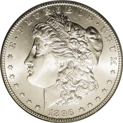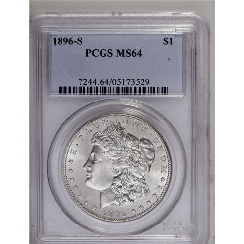 <B>1896-S<img border='0' src='http://www.heritagecoins.com/images/star.gif' width=10 height=10>$1> MS64 PCGS.</B></I> VAM-2. The peak of the 6 is repunched. This brilliant and lustrous better date silver dollar is unusually clean for the MS64 level, and the grade is limited solely by the somewhat soft central strike. Although the 1896, 1896-O, and 1896-S all have mintages between 5 and 10 million pieces, their availability differs drastically. The 1896 is common, the 1896-O is conditionally rare in Mint State, and the 1896-S is scarce regardless of grade.