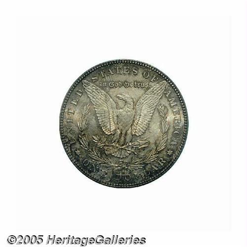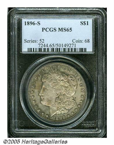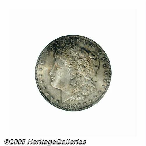 <B>1896-S<S$1> MS65 PCGS.</B></I> A silky smooth Gem that is liberally coated in milky gray-lilac and coppery-orange toning. Only the normal striking deficiency is noted over Liberty's ear and a small spot is rather inconspicuously located behind the portrait. The 1896-S Morgan was an extremely challenging issue in Mint State before the release of the famous Redfield hoard. Even after the influx of Uncirculated pieces from the massive Nevada estate, which still didn't keep up with increasing collector demand, true Gem examples have remained a very scarce commodity. The present representative combines blatant originality with refreshingly unabraded surfaces. Population: 47 in 65, 3 finer (6/05).