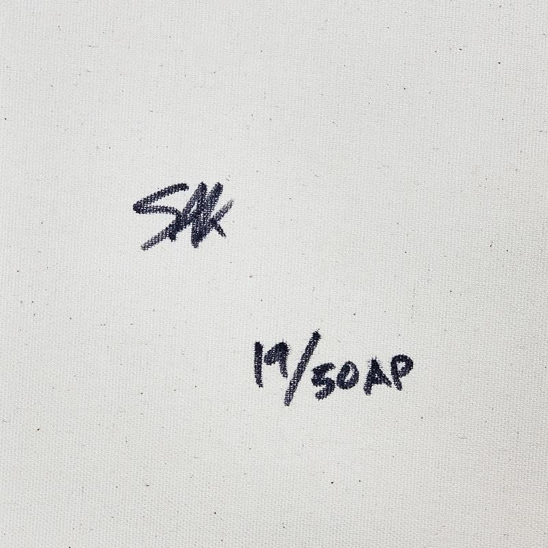 "1896 $2.00 Silver Certificate Bill" is a limited edition hand pulled silkscreen mixed media on canvas by Andy Warhol protege Steve Kaufman (1960-2010). This piece is numbered and AP 19/50 and hand signed inverso. Includes letter of authenticity. As is common with Kaufman's works, this piece may have perceived minor flaws, but is in overall good condition. Measures approximately 18" x 34.5" (image).