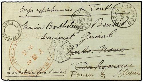 1896 Stampless Military cover to Dahomey from Tonkin Expedition. Struck with ´Corps Exp. Tonkin/Ligne No. 6´ in black and Langson/Tonkin despatch cds (June 4); front also bears red Army cachet and octagonal ´Loango a Marseille/L.M.No.3´ datestamp. Further cds´s on reverse from Hanoi, Cotonou etc., an unusual cover.