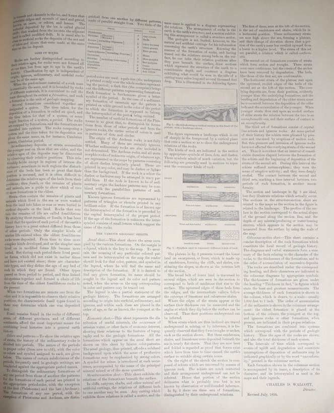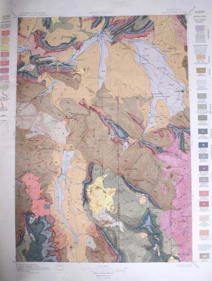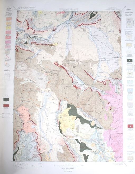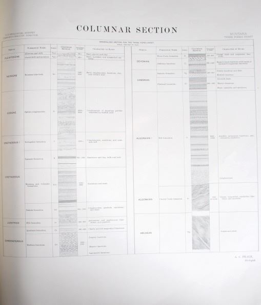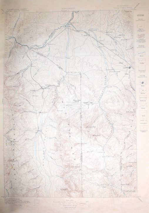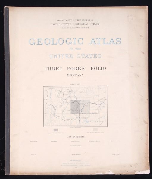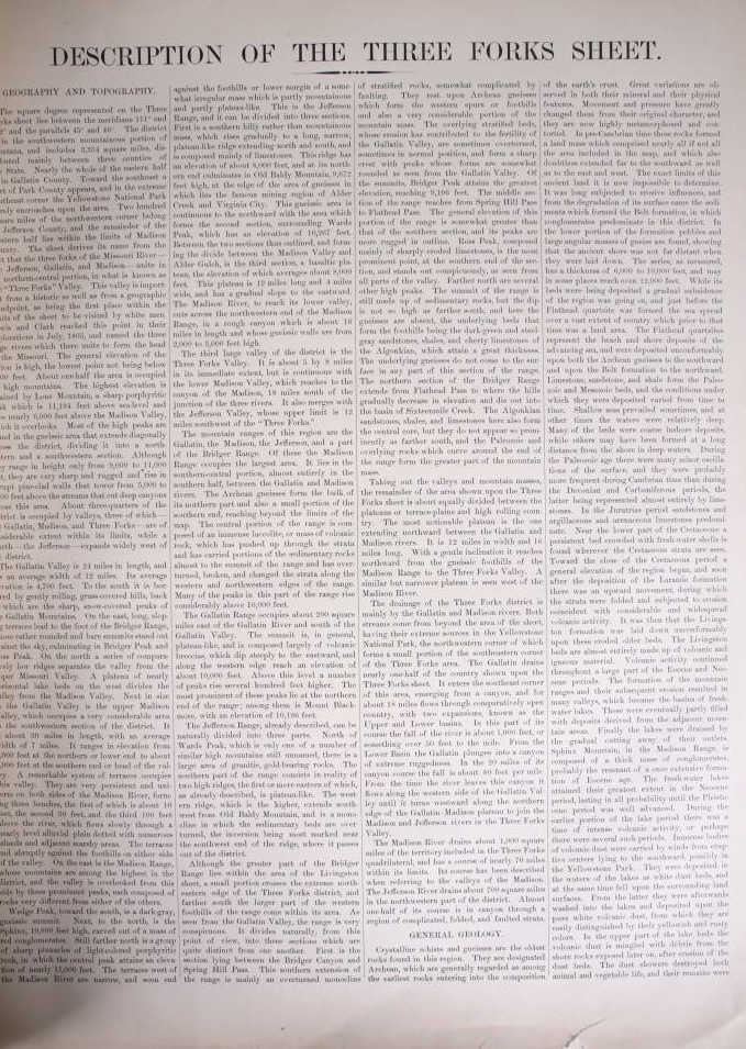 For your consideration is this 1896 Geological Atlas of the United States: Three Forks Folio Montana. The town of Three Forks derived its name from the headwaters of the Missouri which is the confluence of the three rivers that are the source of the longest river system on the continent, the Missouri-Mississippi drainage. In 1805, Captains Meriwether Lewis and William Clark and the Corps of Discovery camped at the headwaters of the Missouri River. This is a geological atlas of Three Forks, Montana and includes information, such as descriptions, topography, areal geology, economic geology, structure sections, and columnar sections. A geologic map or geological map is a special-purpose map made to show various geological features. Rock units or geologic strata are shown by color or symbols. Bedding planes and structural features such as faults, folds, are shown with strike and dip or trend and plunge symbols which give three-dimensional orientations features. Stratigraphic contour lines may be used to illustrate the surface of a selected stratum illustrating the subsurface topographic trends of the strata.