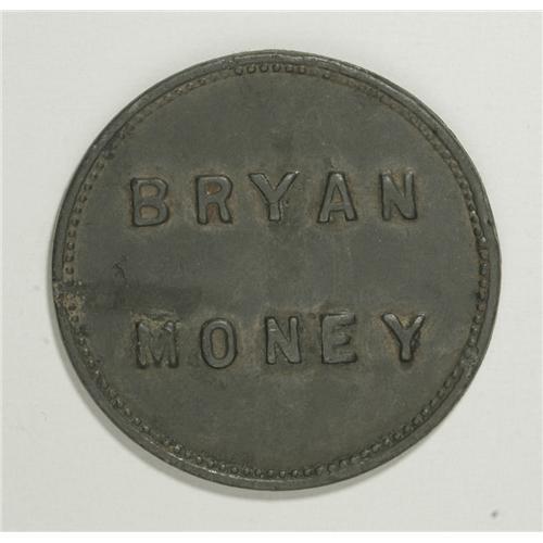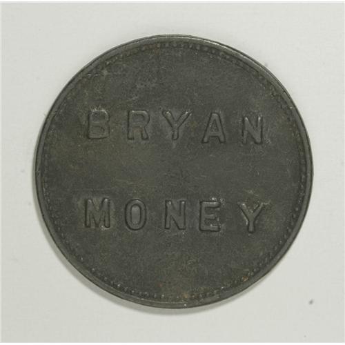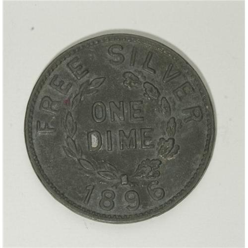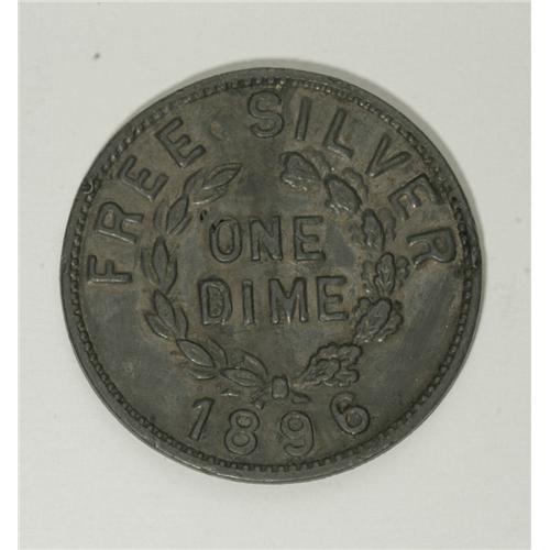 <B>1896 Free Silver Dime Bryan Money Uncertified.</B></I> Zerbe-32. S-326. Two tokens. Cast in type metal. Diameter 44mm. Weight 32 grams. Obverse shows FREE SILVER at upper periphery, ONE DIME in the center surrounded by wreath, and 1896 in the exergue, with raised rim and border of dots. Reverse shows BRYAN MONEY in large letters, BRYAN above. Struck in conjunction with William Jennings Bryan unsuccessful campaign for the Presidency in 1896.<BR><BR><b>Shipping:</b> Coin/Currency (<a target="_blank" href="http://www.heritageauctions.com/common/shipping.php">view shipping information</a>) <BR><BR><B>Import