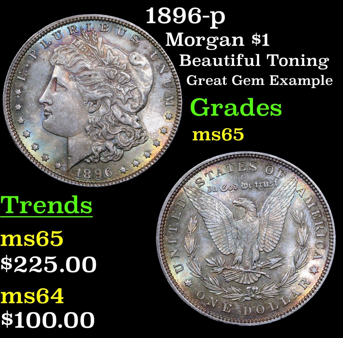 1896-p Beautiful Toning Great Gem Example Morgan Dollar $1 Grades GEM Unc.