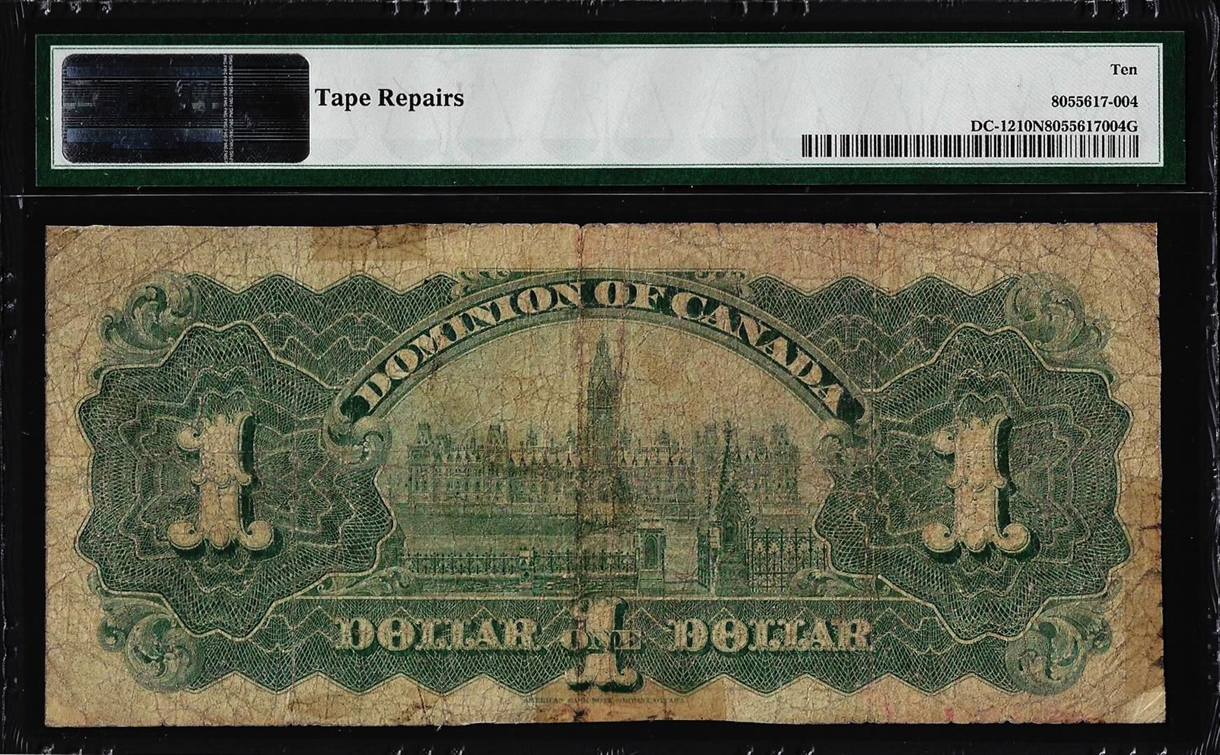 One 1897 $1 Dominion of Canada Note DC-12 PMG Very Good 10 Net. PMG Certified.