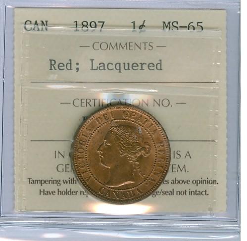 1897 1¢ ICCS MS65RD. Designated as lacquered, 85% red.
