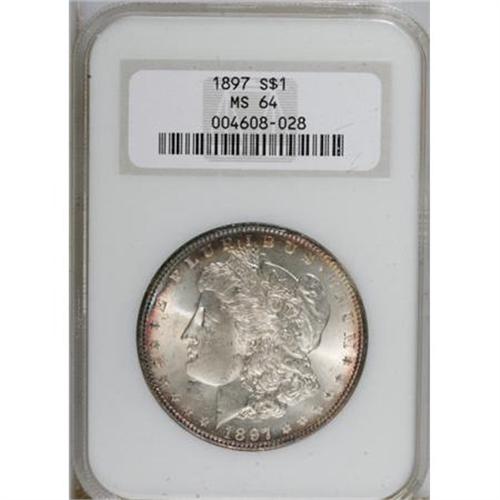 <B>1897 $1 MS64 NGC.</B></I> NGC Census: (4490/1414). PCGS Population (3660/1472). Mintage: 2,822,731. Numismedia Wsl. Price for NGC/PCGS coin in MS64: $55. (#7246)<BR><BR><B>Coin Engraver:</B> George T. Morgan<BR><BR><b>Shipping:</b> Coins & Currency (<a target="_blank" href="http://www.heritageauctions.com/common/shipping.php">view shipping information</a>)