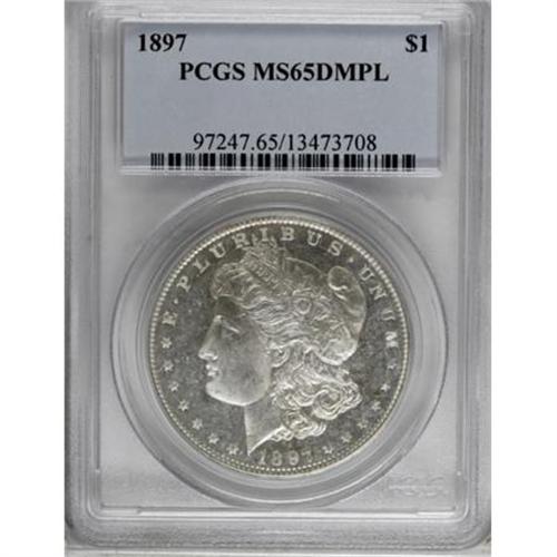 <B>1897 $1 MS65 Deep Mirror Prooflike PCGS.</B></I> Delightful deep mirrors enliven each side of this Gem with frosty devices, silvery on the obverse and with pale-copper and steel-blue iridescence on the reverse. A seldom-seen issue in Deep Mirror Prooflike, one of only 23 so graded at PCGS, with two finer (8/07).<BR><BR><b>Shipping:</b> Coins & Currency (<a target="_blank" href="http://www.heritageauctions.com/common/shipping.php">view shipping information</a>)
