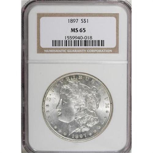 <B>1897 $1 MS65 NGC.</B></I> NGC Census: (1253/161). PCGS Population (1229/242). Mintage: 2,822,731. Numismedia Wsl. Price for NGC/PCGS coin in MS65: $200. (#7246)<BR><BR><B>Coin Engraver:</B> George T. Morgan<BR><BR><b>Shipping:</b> Coins & Currency (<a target="_blank" href="http://www.heritageauctions.com/common/shipping.php">view shipping information</a>)