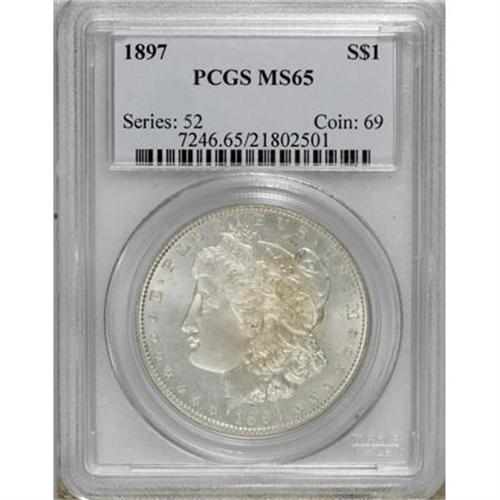 <B>1897 $1 MS65 PCGS.</B></I> . PCGS Population (1245/244). NGC Census: (1262/163). Mintage: 2,822,731. Numismedia Wsl. Price for NGC/PCGS coin in MS65: $215. (#7246)<BR><BR><B>Coin Engraver:</B> George T. Morgan<BR><BR><b>Shipping:</b> Coins & Currency (<a target="_blank" href="http://www.heritageauctions.com/common/shipping.php">view shipping information</a>)