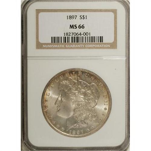 <B>1897 $1 MS66 NGC.</B></I> With a mintage of slightly over 2.8 million pieces, Philadelphia produced the fewest silver dollars of the three mints in 1897. Airy yellow-orange color graces the peripheral zones, while the strongly lustrous centers have hints of steel-gray patina. Crisply struck with strong luster beneath the toning.<BR><BR><b>Shipping:</b> Coins & Currency (<a target="_blank" href="http://www.heritageauctions.com/common/shipping.php">view shipping information</a>)